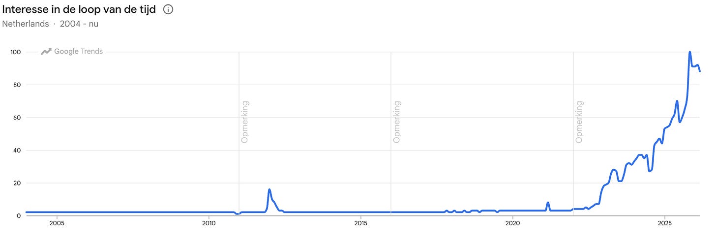 Als je op Google Trends kijkt naar de zoekterm “AI”, zie je iets interessants. In 2012 ontstond uit het niets een kleine piek. Onderzoekers maakten een doorbraak in beeldherkenning met “deep learning”. Computers konden opeens foto’s herkennen. Indrukwekkend, maar het raakte de gewone mens niet.